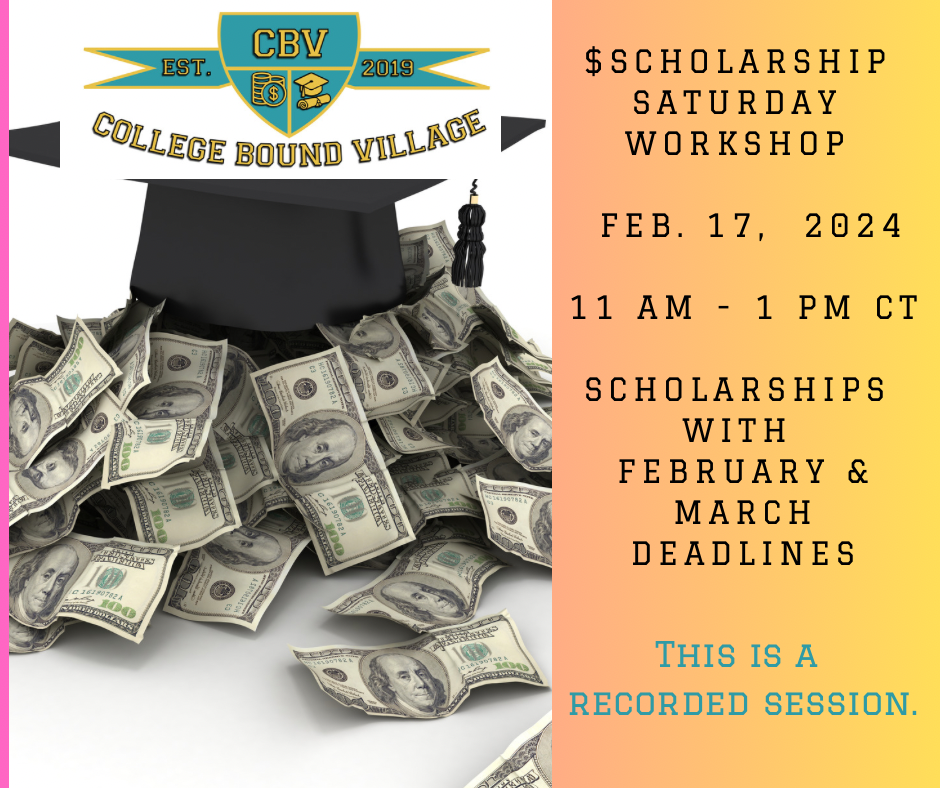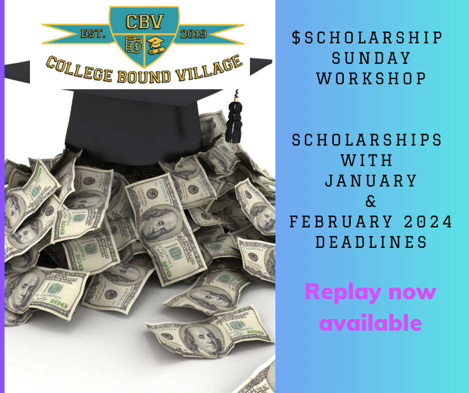 Are you ready to kick-off this year with a bang🧨? Get a jump start on scholarships as Lili St. Christopher walks participants through scholarship websites/resources with Jan. and Feb. 2024 deadlines. Target Audience: - Rising High School Juniors, Seniors, and/or their Parents - Current College students and/or their Parents ** included in all CBV Academy Annual VIP memberships.