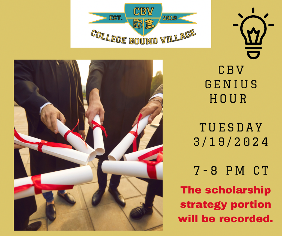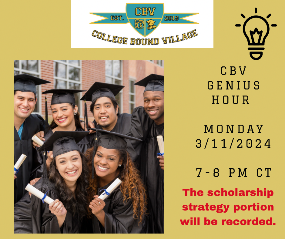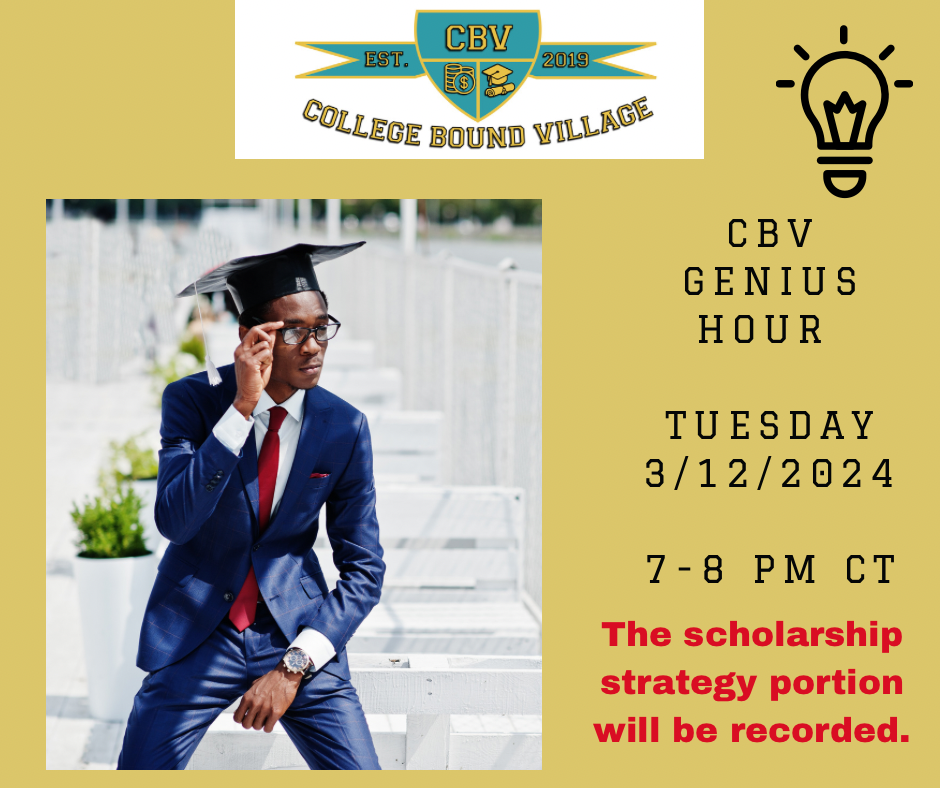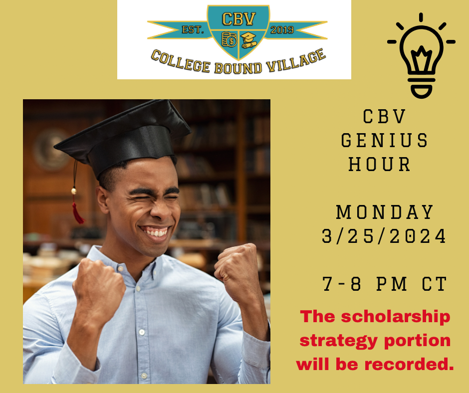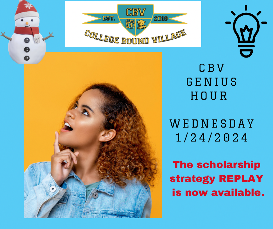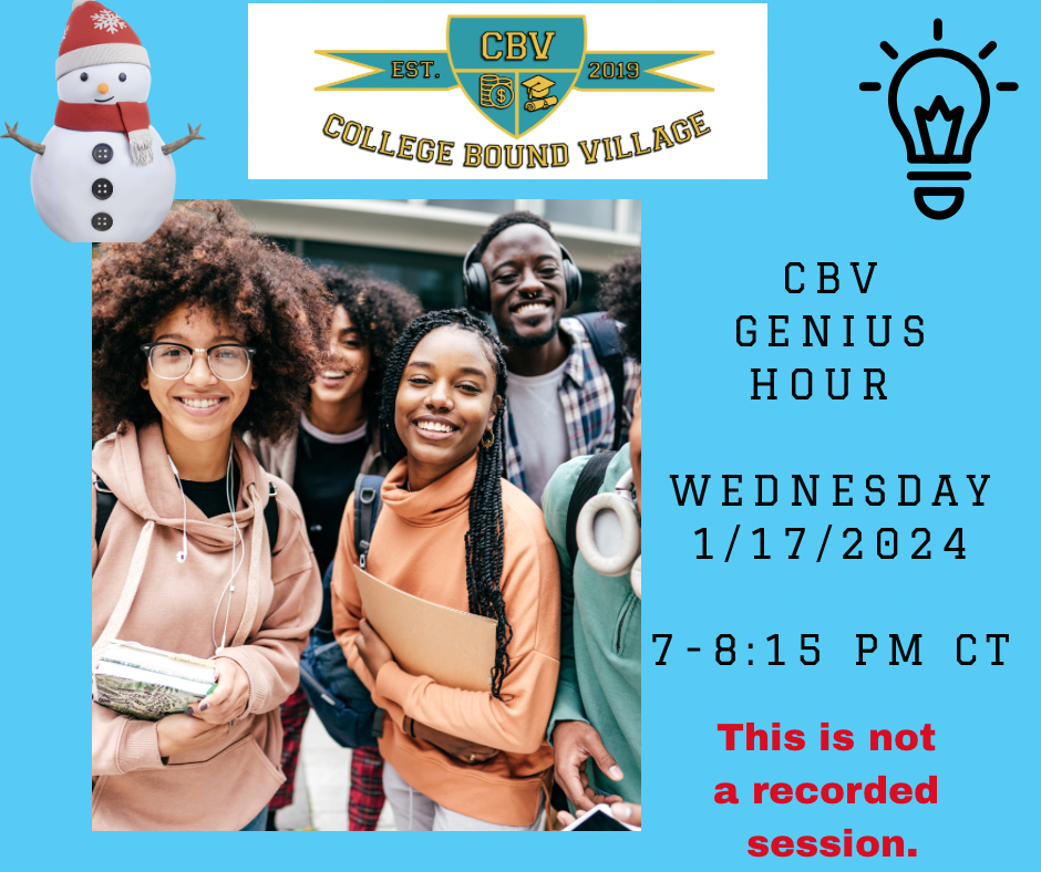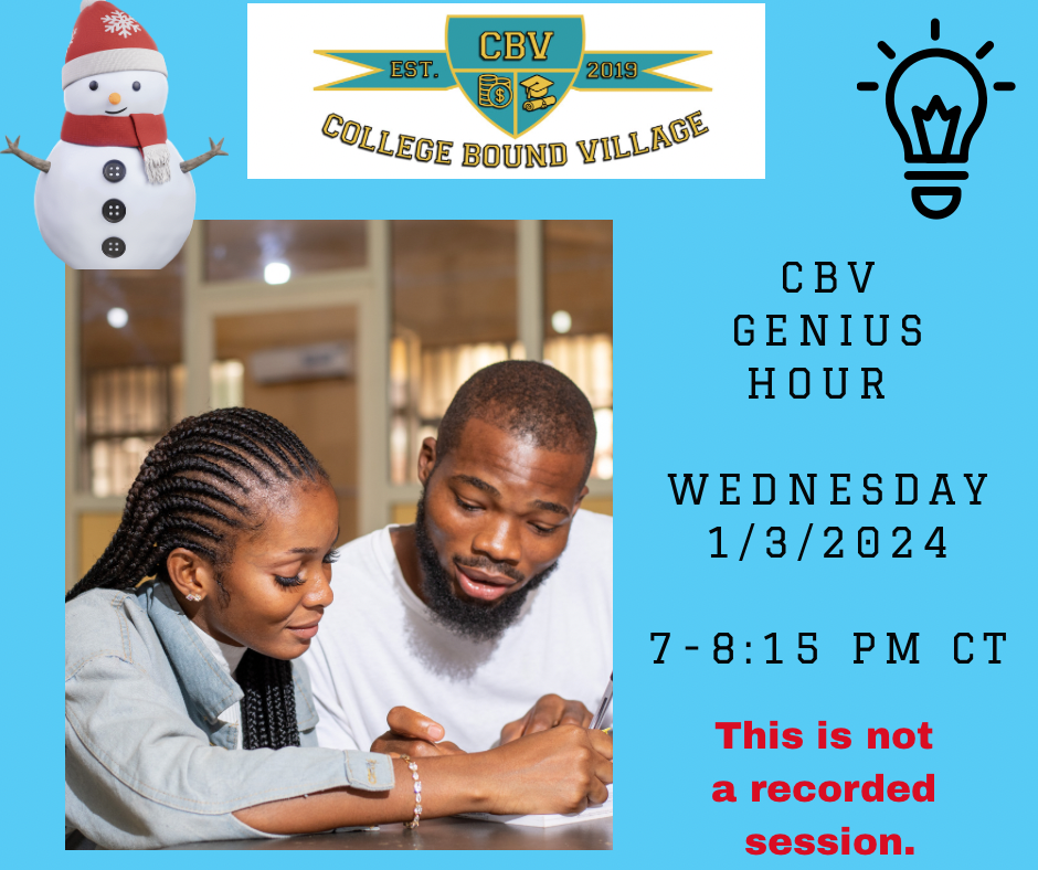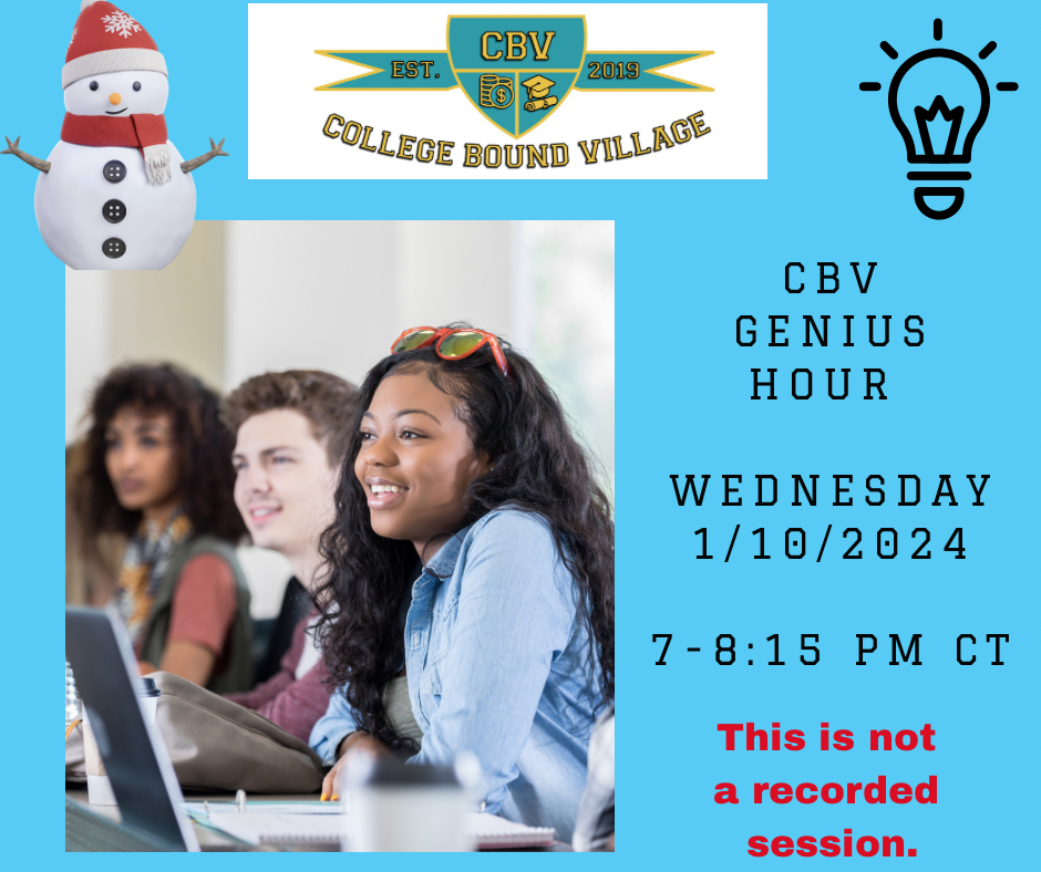 Happy New Year🎉! Are you ready to make ⏰ and space to focus on 🎓college-bound success? During the first 15 mins., Lili will review scholarship strategies. For the next hour, parents and scholars will utilize the Pomodoro method to focus on their most relevant challenges, including Scholarships, Essays, and Q/A with Lili. * This CBV Genius Hour session is included in the CBV Academy Annual VIP Memberships.