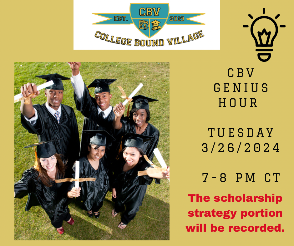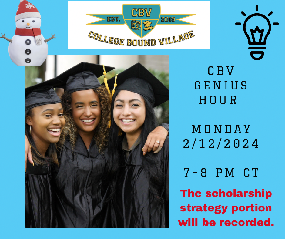 Are you ready to end this year with a bang🧨? Get a jump start on scholarships as Lili St. Christopher walks participants through scholarship websites/resources with Dec. 2023 and Jan. 2024 deadlines during this virtual Zoom workshop. Target Audience: - Rising High School Juniors, Seniors, and/or their Parents - Current College students and/or their Parents ** included in all CBV Academy Annual VIP memberships.