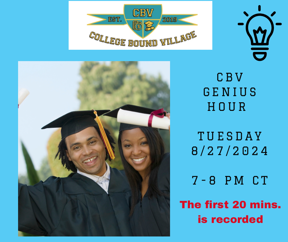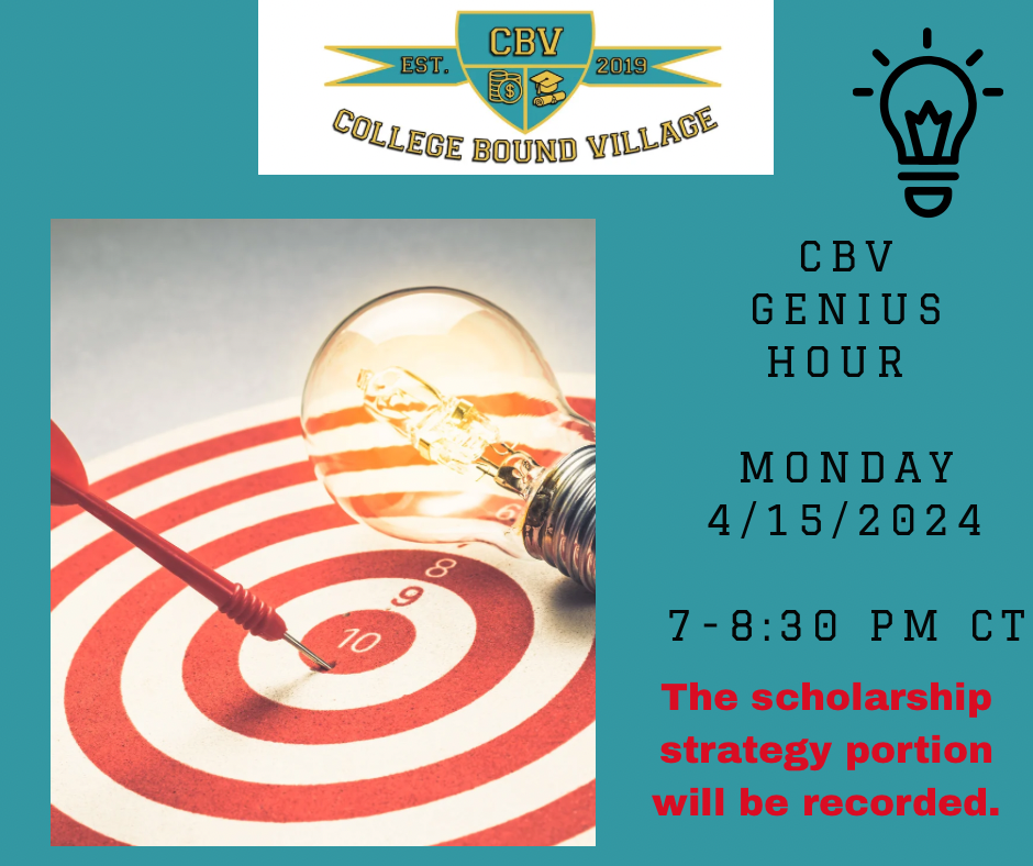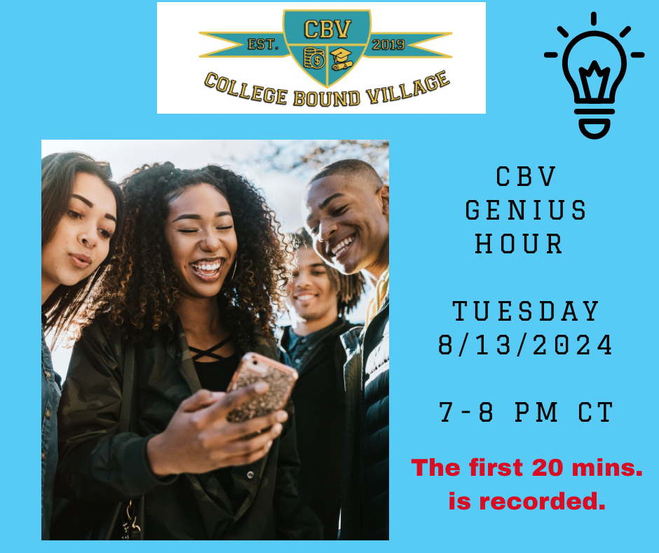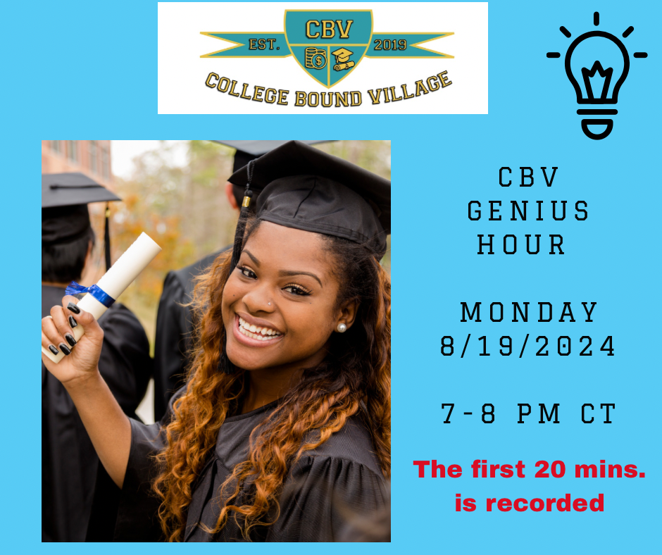 Hello August🎉! Let’s make ⏰ and space to focus on 🎓college-bound success. During the first recorded 20 mins., Lili will review scholarship websites and answer questions. Afterward, parents and scholars will utilize the Pomodoro method to focus on their most relevant challenges, including Scholarships. * This CBV Genius Hour session is included in the CBV Academy Annual VIP Memberships.
