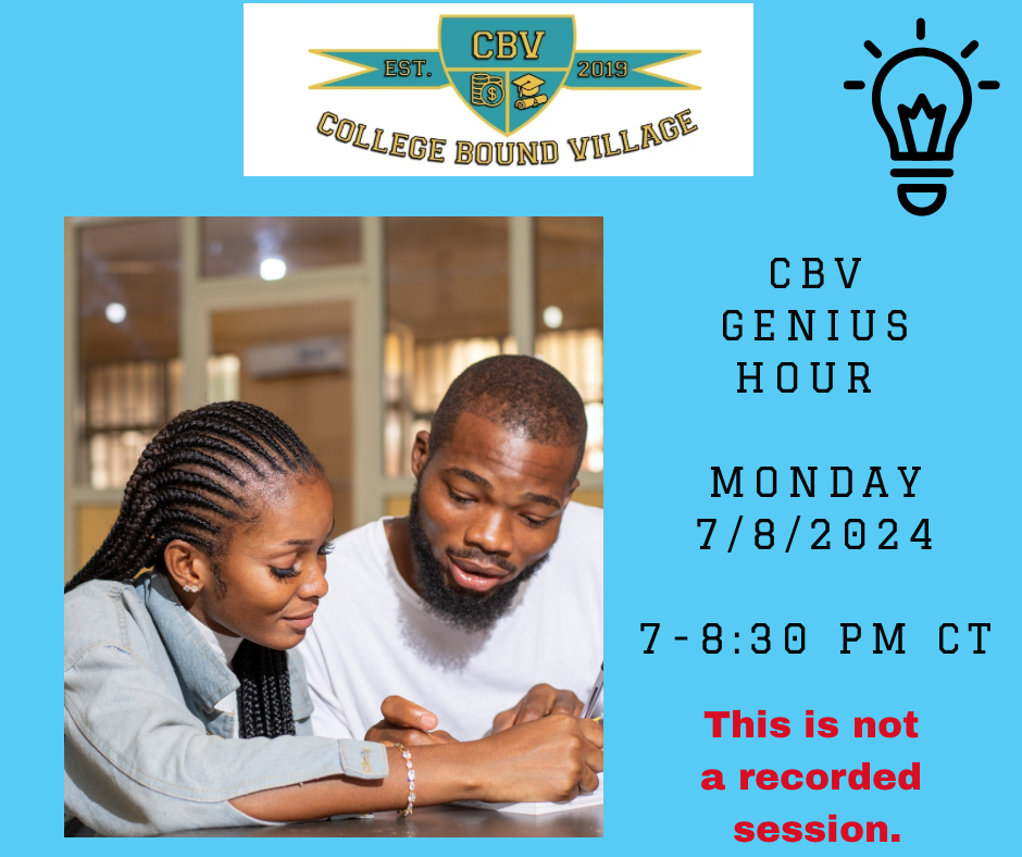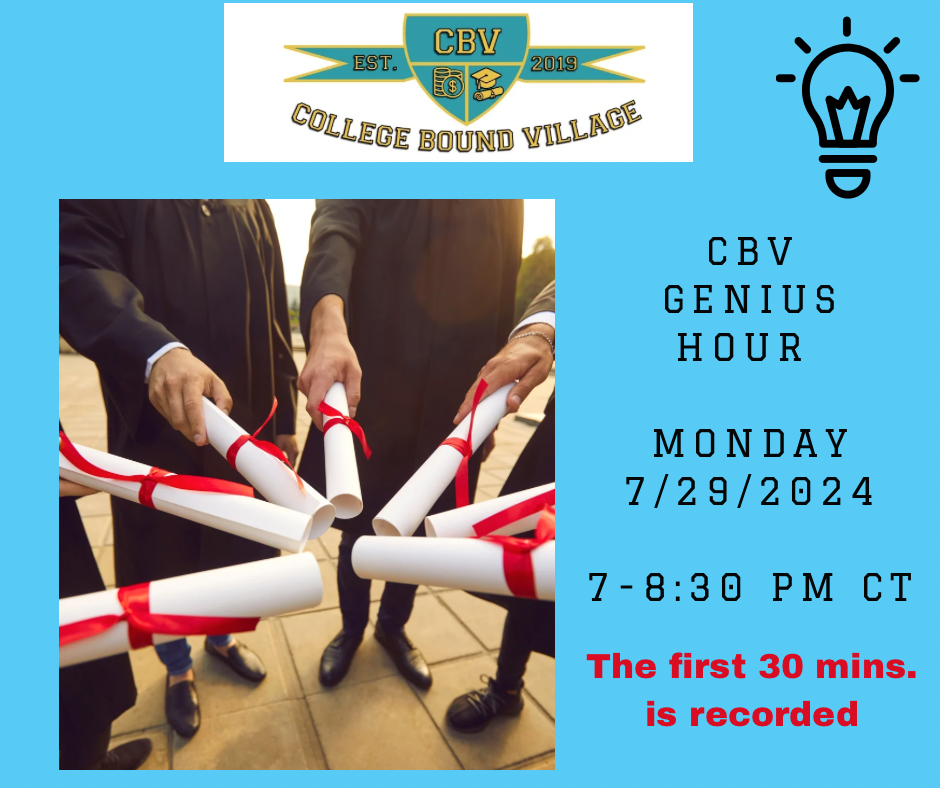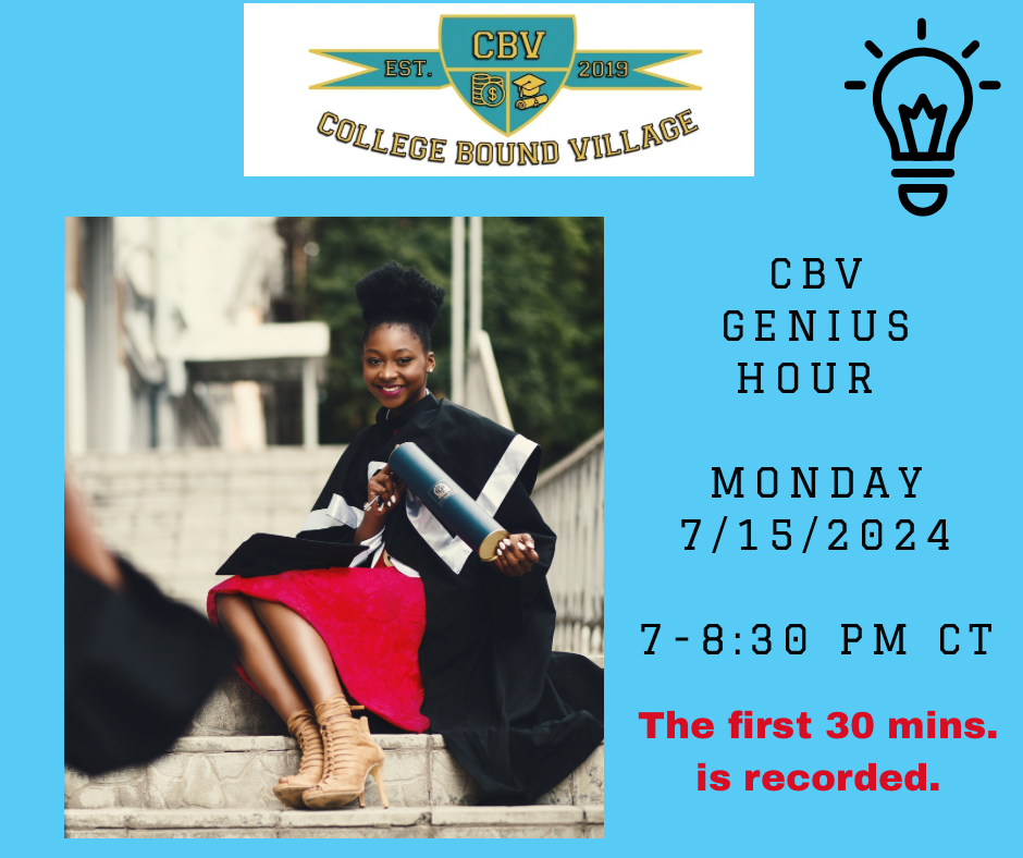 Hello July🎉! Let’s make ⏰ and space to focus on 🎓college-bound success. During the first recorded 20 mins., Lili will review scholarship websites and answer questions. Afterward, parents and scholars will utilize the Pomodoro method to focus on their most relevant challenges, including Scholarships. * This CBV Genius Hour session is included in the CBV Academy Annual VIP Memberships.