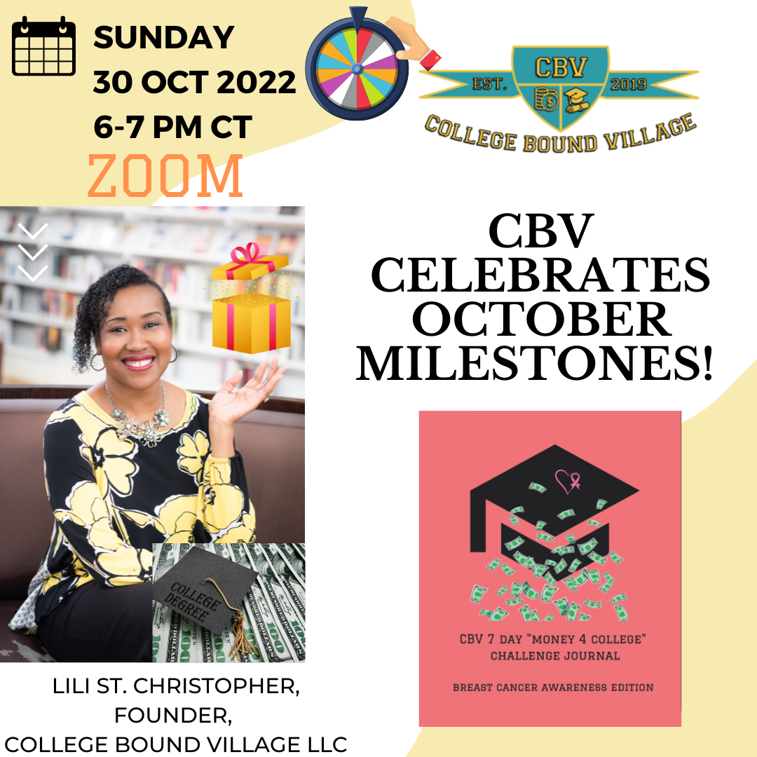 You're welcome to join Lili St. Christopher via Zoom as we celebrate our October CBV successes. Did your scholar get admitted into college? Did you complete the F.A.F.S.A. this month? Did your scholar earn a scholarship or special accomplishment?